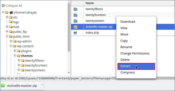 - Masuk kembali ke File Manager di folder public_html/wp-content/themes, dan di kotak sebelah kanan, anda akan melihat file installer theme wordpress anda yang baru saja diupload. Klik kanan, lalu pilih Extract.